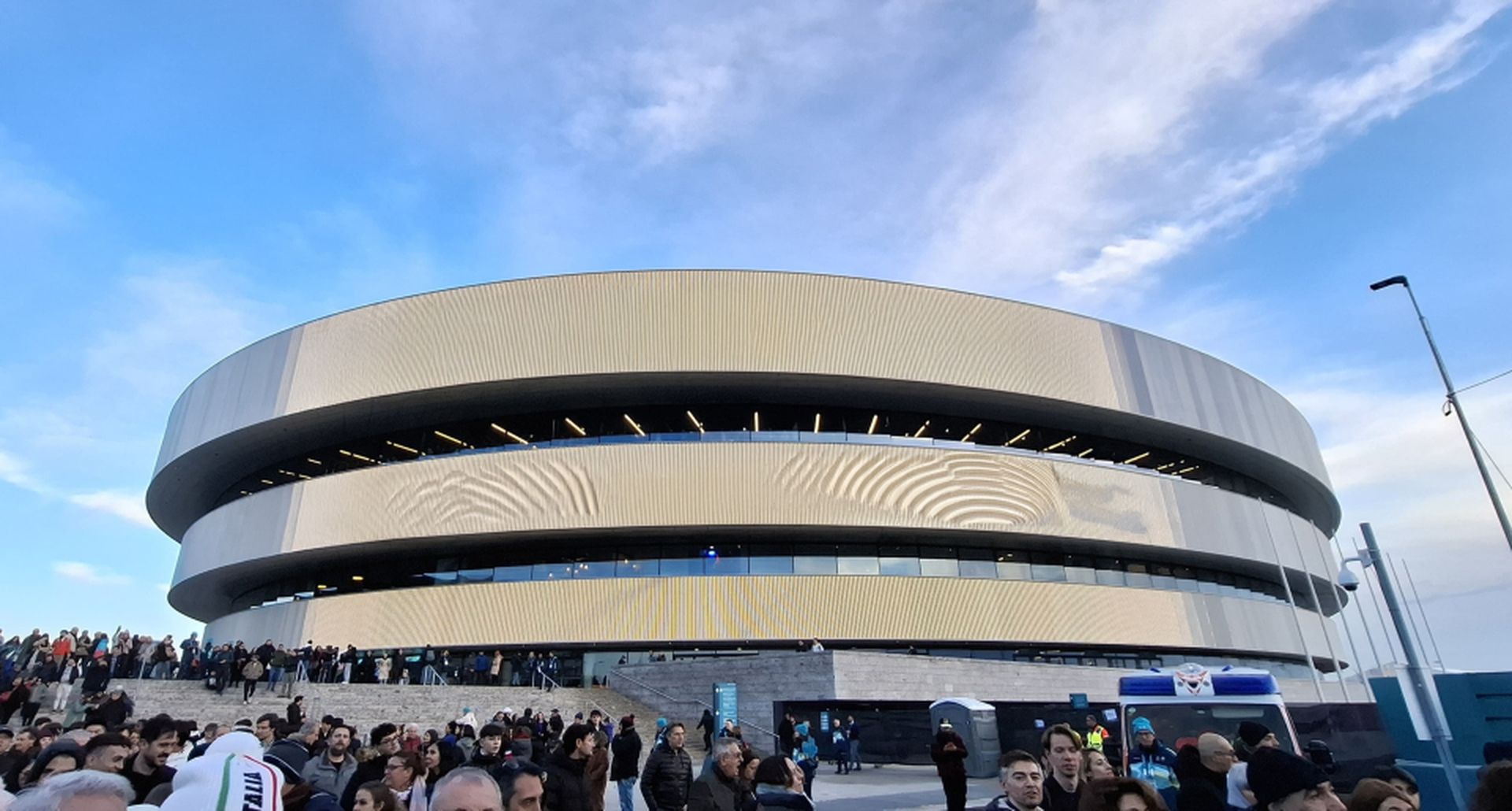 The project began in 2020, followed by groundbreaking in the second quarter of 2023. Trevi completed piling and foundations in just three months, after which structural works throughout 2023 and 2024 saw the rise of the three metallic rings and elliptical shell. Between 2024 and 2025, Arena Impianti Scarl installed the MEP heart of the building, and in the final quarter of 2025 the arena entered testing and commissioning, including final air balancing and ice management trials. In February 2026, the venue prepared to host its first official high‑level winter sports events.