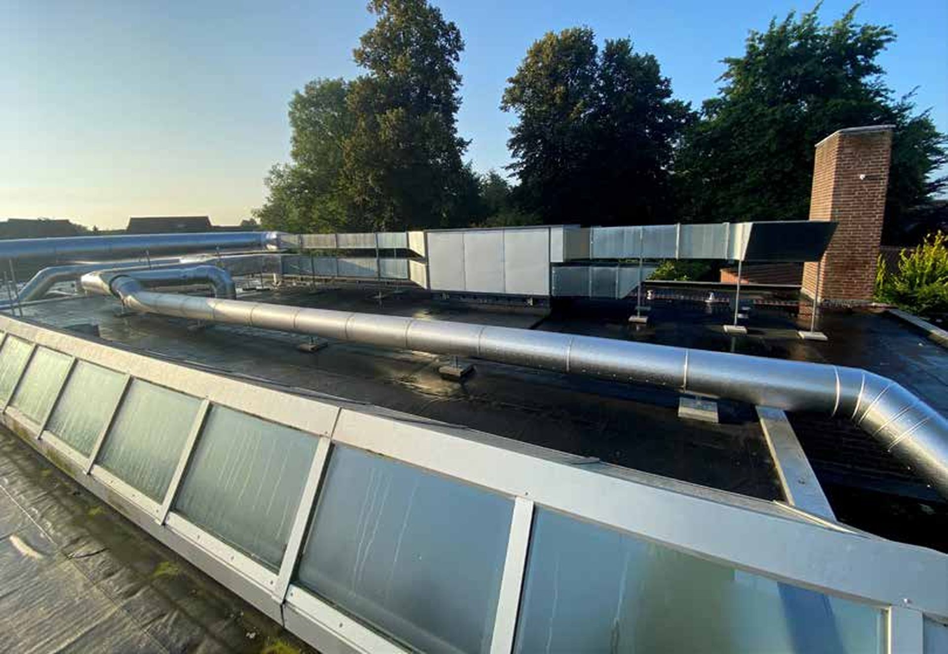 “De luchtbehandelingsunits zijn gekoppeld aan een hoofdkanaal/distributiekanaal, die in het zicht is gebleven”, vertelt Van de Pas. “Dit stelde hoge eisen aan de montage én afwerking. Om een tochtvrije en gelijkmatige luchtverdeling in alle lokalen te borgen, maken wij gebruik van de luchtverdeelslangen van KE Fibertec. De afvoer van gebruikte lucht gebeurt op basis van overstort. Tussen de lokalen en gangen zijn speciale overstort-/luchtroosters geïnstalleerd, waardoor we gebruikte lucht centraal uit de gangzones kunnen afzuigen. Alleen de ruimtes waar zo’n overstortvoorziening niet mogelijk was, worden lokaal afgezogen.” Op het dak van De Schakel is gekozen voor één Geniox luchtbehandelingsunit, vertelt hij. “In tegenstelling tot de overige twee basisscholen wordt hier tevens met lucht verwarmd. In de toekomst wordt waarschijnlijk nog een warmtepomp aan de installatie toegevoegd, die de luchtbehandelingsunit voorziet van warmte en koeling."
